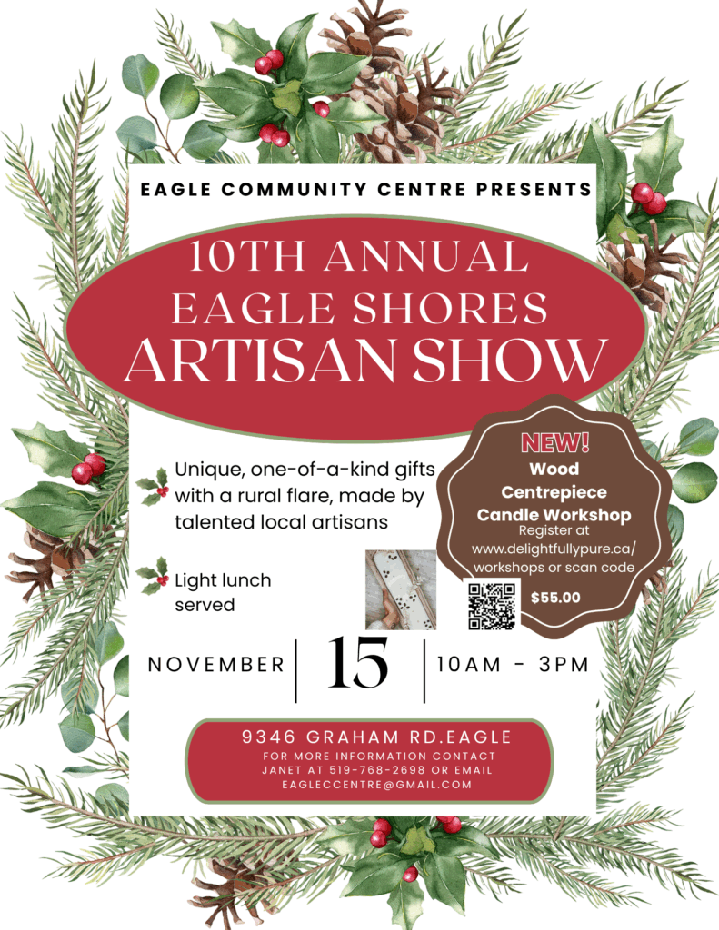 2025 Eagle Shores Artisan Show. Beautiful one of a kind gifts, candle workshop, bake table, prizes and light lunch