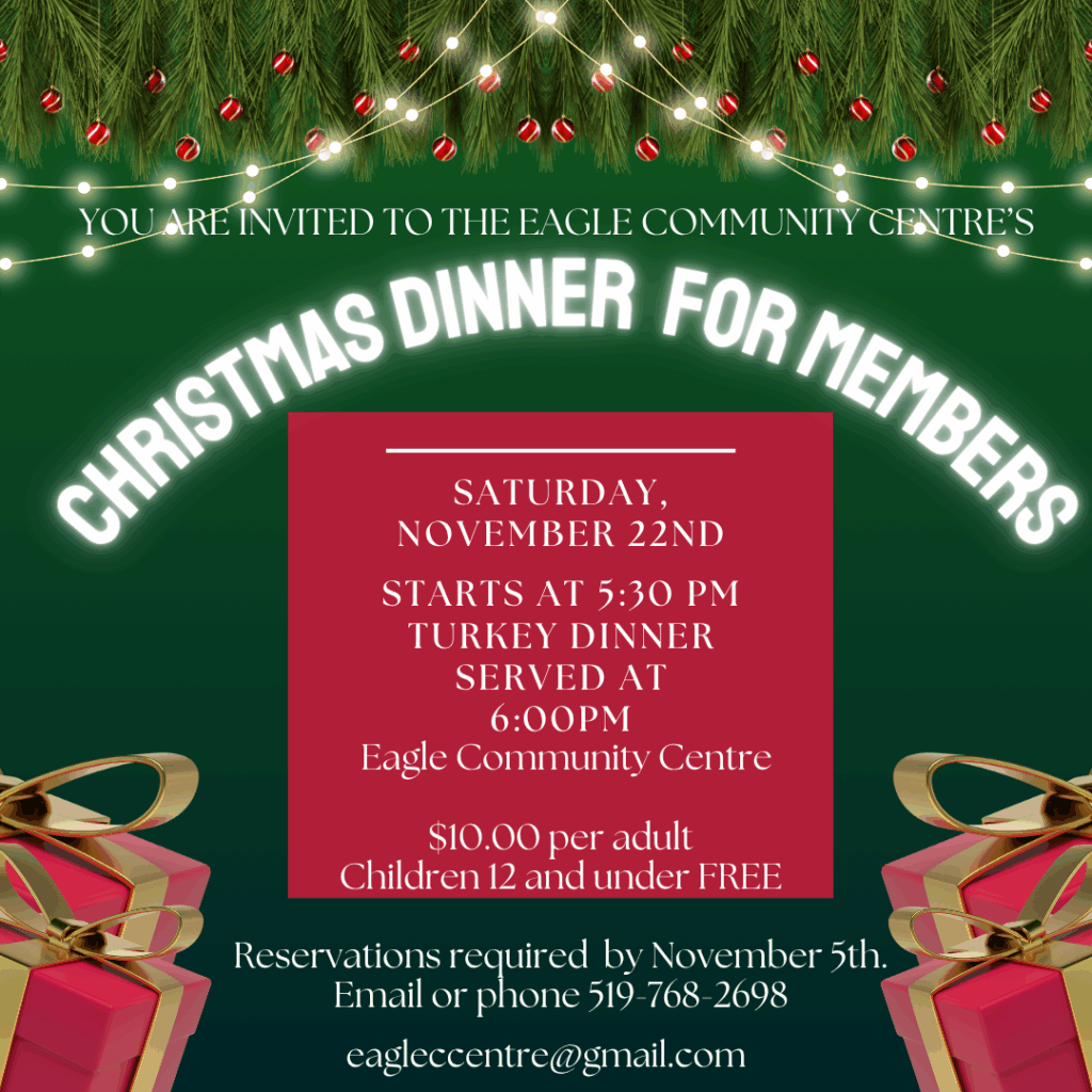 Eagle Community Centre’s Members Christmas Dinner. 5 pm – All members and their families invited to attend. Directors will provide ham, turkey, potatoes and gravy. Please bring your favourite dish to complement the meal. Please RSVP by November 24th by contacting Janet at 519-768-2698 or eagleccentre@gmail.com