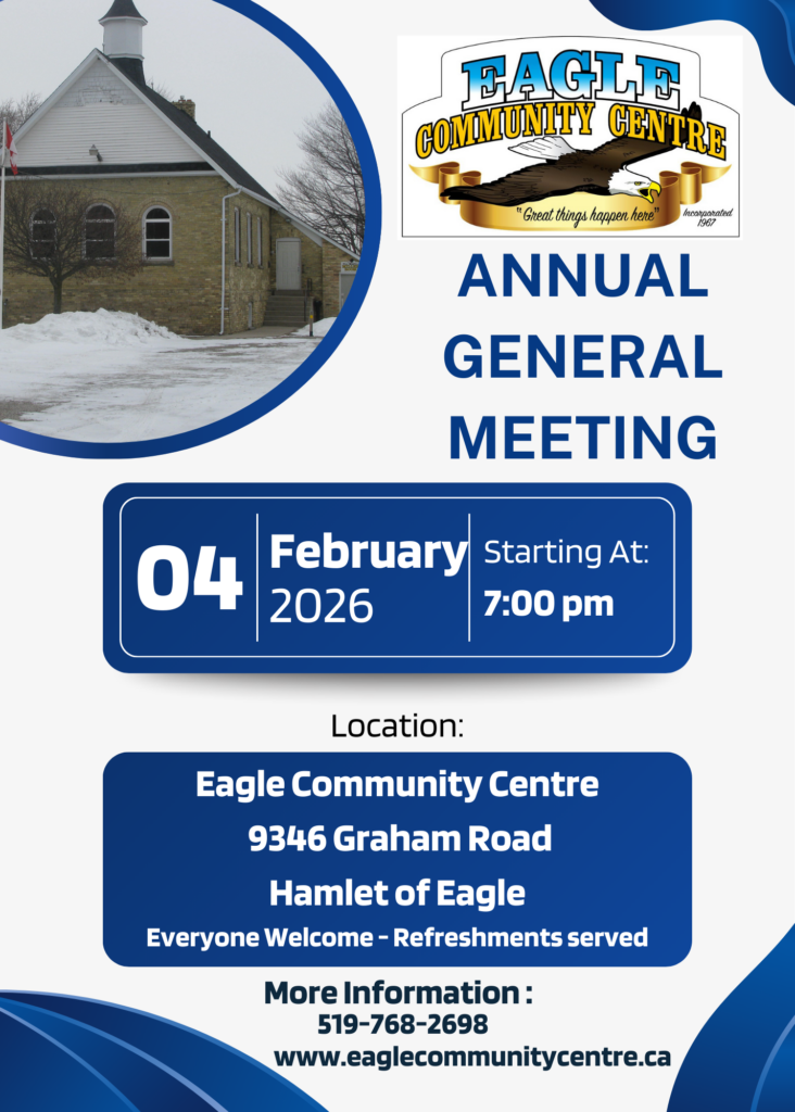 Come support the Eagle Community Centre and consider joining our Team. Let’s ensure this historical building remains in the Hamlet of Eagle for years to come. For more information on how you can help, contact Janet at 519-768-2698 or email: eagleccentre@gmail.com